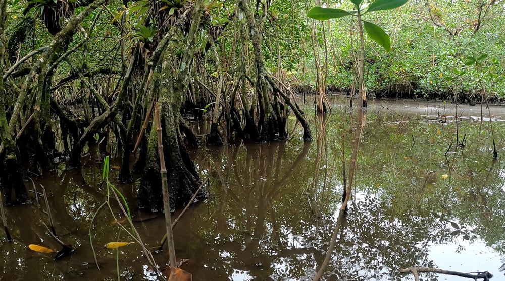 A Trilha começa com a travessia de barco do Rio Itapanhaú, seguindo em meio a mata passando pelo manguezal e restinga.